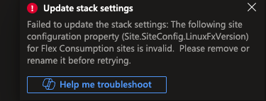 The following site configuration property (Site.SiteConfig.LinuxFxVersion) for Flex Consumption sites is invalid. Please remove or rename it before retrying.